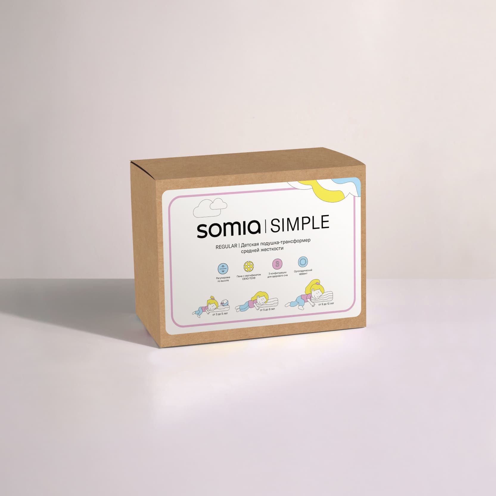 Упрощенная версия нашего бестселлера – подушки Somia Kids: для тех, кто точно знает, что ребенок любит спать на упругих подушках. Детская подушка Somia Simple Regular – это подушка средней жесткости, которую можно настраивать по высоте. Если вы ищете мягкую подушку для ребенка, обратите внимание на детскую версию Somia Simple Soft.